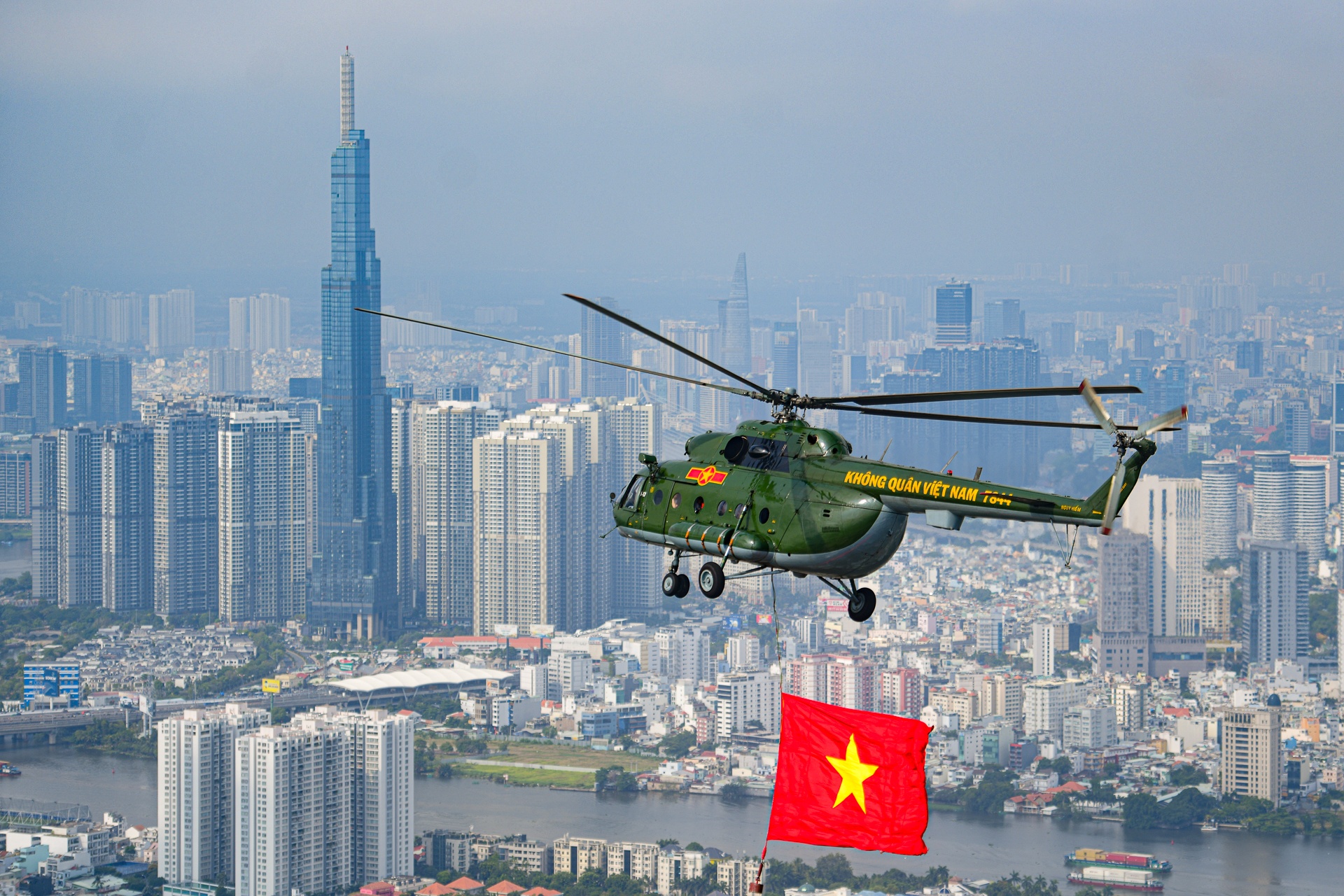 TP.HCM hiện đại nhìn từ trực thăng kéo cờ